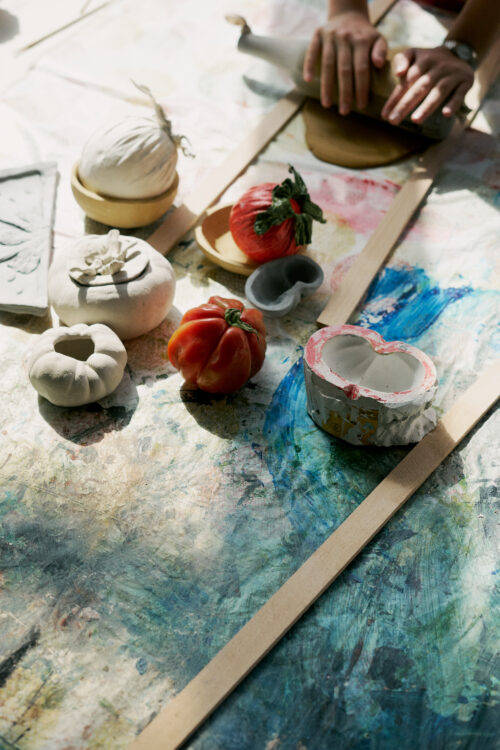 During the 2023/2024 school year, Maria Walcher collaborated with BAU on the project Caldera Paradullis. Together with second-grade classes from the Lagundo primary school, she developed a workshop series focused on materiality, inviting children to work with ceramic. By observing tomatoes and their many shapes, tomato-inspired bowls emerged, while slices of tomato were transformed into lively, colorful plates.